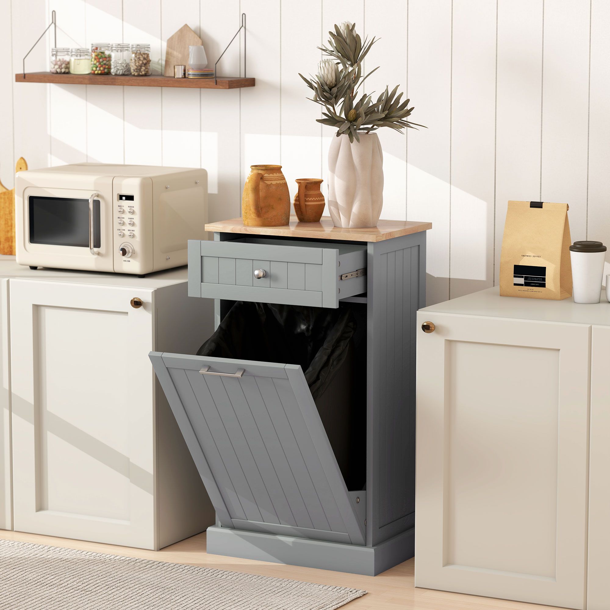 2.- Saving Space: This tilt out trash cabinet features simple design yet large space for garbage or dirty coming with a drawer and a tilting door cabinet for a 10 gallon trash can, and the top can stand dishes, microwaves, even coffee machines